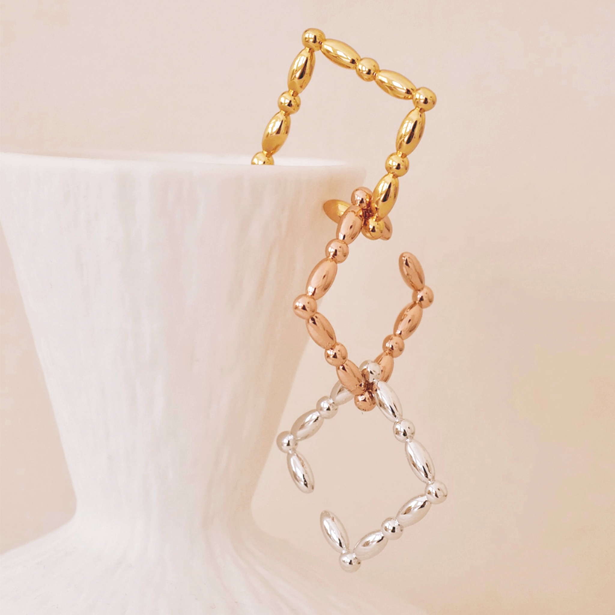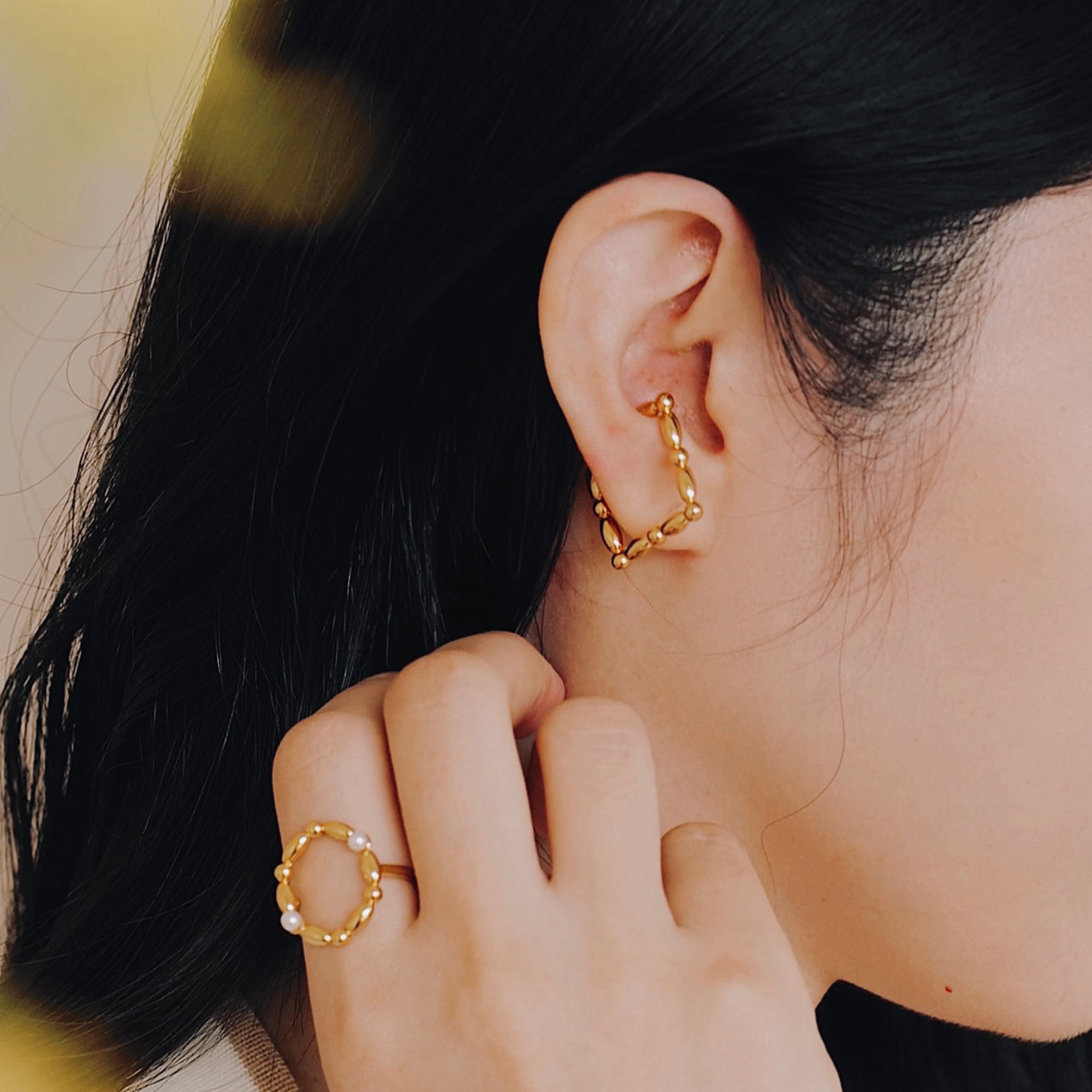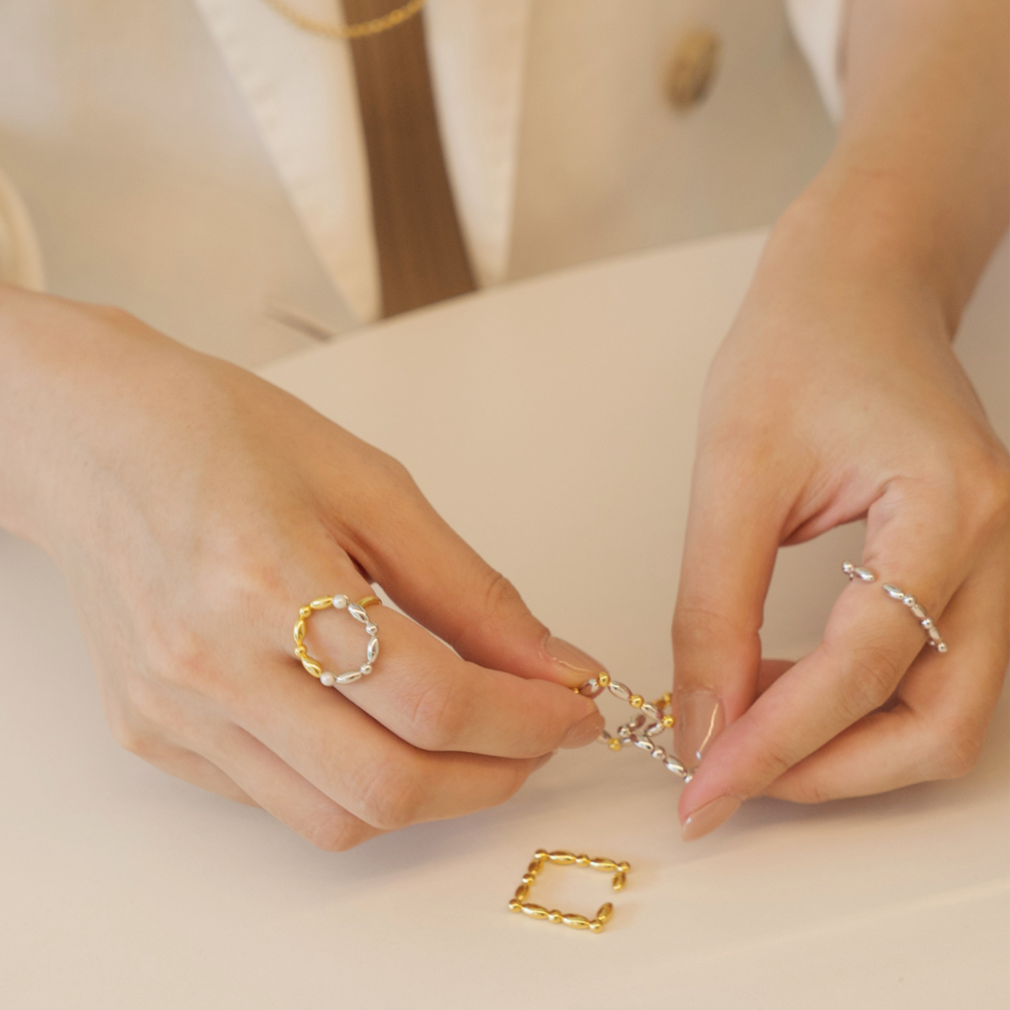 Inspired by beaded silhouettes, this design softens clean geometric lines into smooth, organic curves. The mixed metal tones add a subtle shimmer and dimension with every movement, while its open-ended structure lets you wear it as either an ear cuff or a ring for effortless everyday styling.